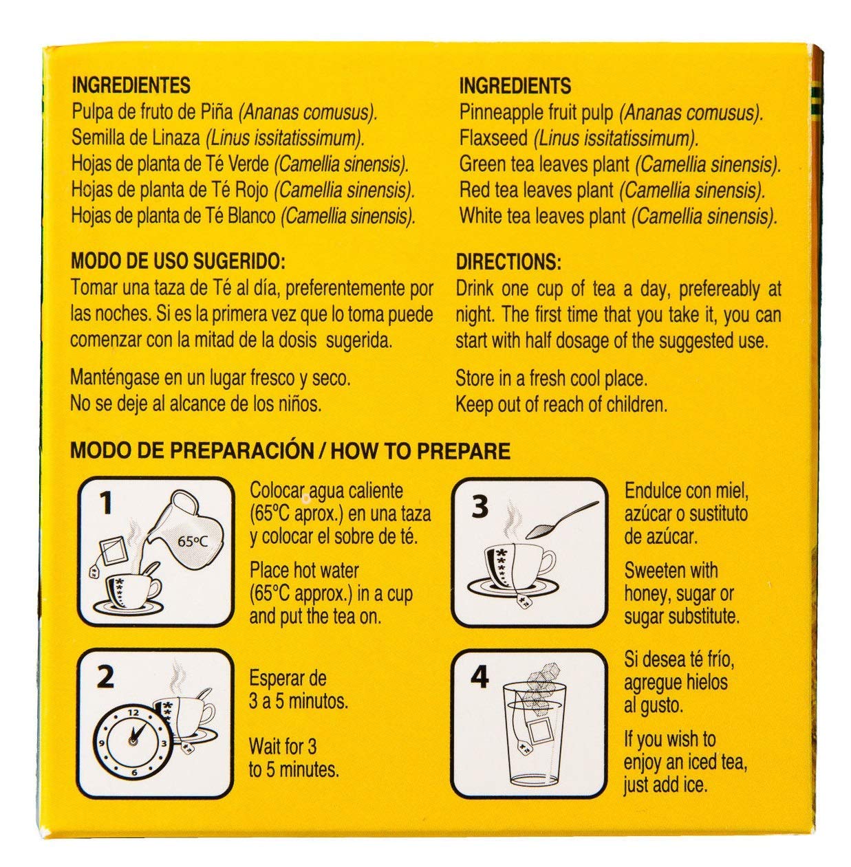 Details: The Original Pineapple Tea 60 Day Supply - Te para 60 Dias Pinalim Tea - the one and only with Pineapple, Red Tea, Green Tea, White Tea and Senna Leaf. How to Use: Steep 1 bag of tea in hot water every night and sweeten to taste (low calorie sweeteners preferred). Drink nightly and Dont worry it's caffeine free.