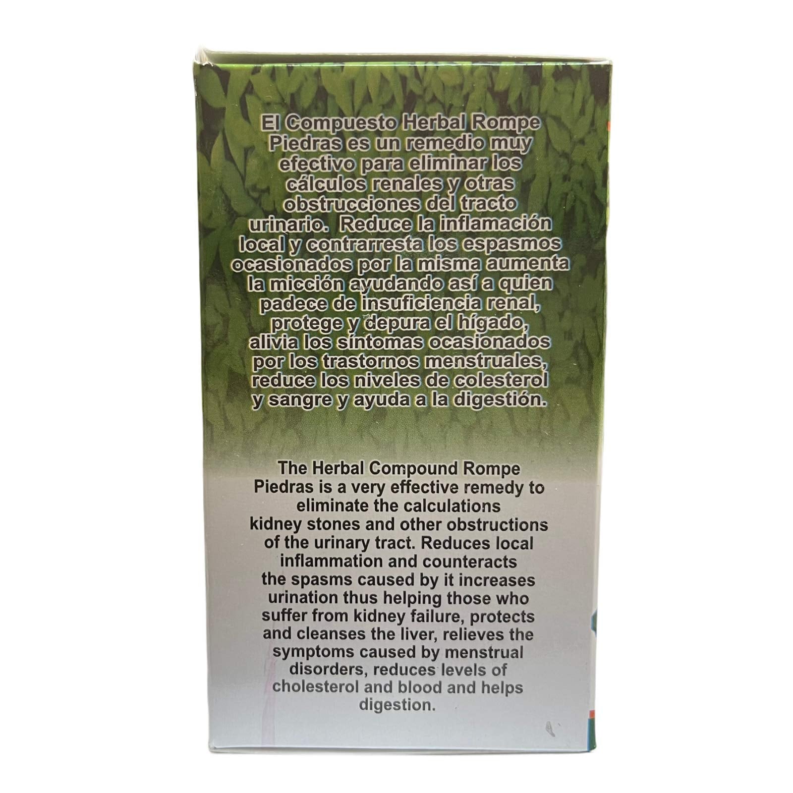 El Compuesto Herbal Rompe Piedras es un remedio muy efectivo para eliminar los cálculos renales y otras obstrucciones del tracto urinario. Reduce la inflamación local y contrarrestra los espasmos ocasionados por la misma aumenta la micción ayudando así a quien padece de insuficiente renal, protege y depura el hígado, alivia los síntomas ocasionados por los trastornos menstruales, reduce los niveles de colesterol y sangre y ayuda a la digestion.